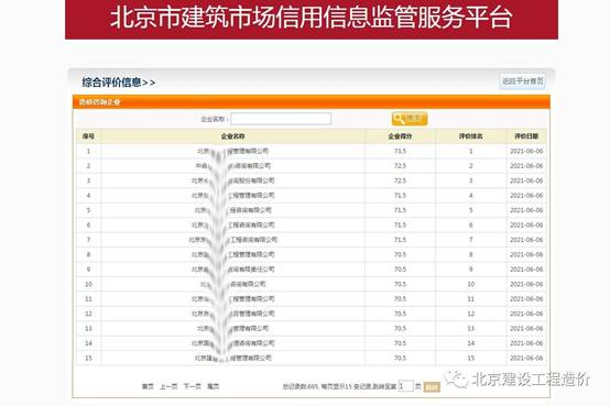 进一步完善造价咨询企业信用评价体系,每日动态更新各企业信用评分,在北京市住建委市场信用信息监管服务平台予以公布。