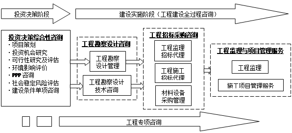 工程咨询方综合运用多学科知识、工程实践经验、现代科学技术和经济管理方法,采用多种服务方式组合,为委托方在项目投资决策、建设实施乃至运营维护阶段持续提供局部或整体解决方案的智力性服务活动。