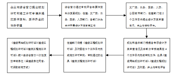 (二)部门审核。行政许可部门收到平台推送的审批信息和审批资料后,按照“并联审批,限时办结”原则分头开展审批工作,其中发改、文广旅、国安、人防、住建部门应在2个工作日内完成专项设计方案审查,并将审查意见上传系统平台,规划和自然资源部门依据各专项审查意见在4个工作日内完成建设工程规划许可审批,并将《建设用地规划许可证》《建设工程规划许可证》上传审批平台,住建部门依据《建设工程规划许可证》开展施工许可审批,根据项目类型同步完成质量监督备案、中标备案等相关手续,在5个工作日内出具《建筑工程施工许可证》。部门并联审批总时限为5个工作日。