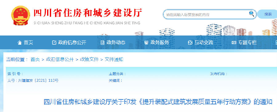 为深入贯彻落实《四川省人民政府办公厅关于推动四川建筑业高质量发展的实施意见》(川办发〔2019〕54号),明确2021-2025年推进装配式建筑发展阶段性目标、重点任务,全面提升装配式建筑发展质量,推动建筑工业化、数字化、智能化升级,我厅制定了《提升装配式建筑发展质量五年行动方案》。现印发你们,请认真组织实施。