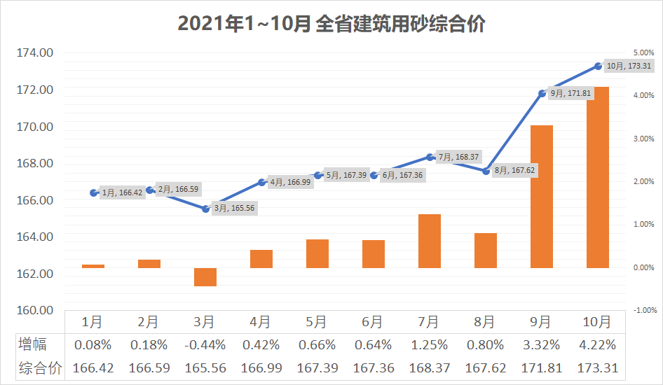 商品砼今年1至8月价格都趋于平稳,与20年12月价格持平,9月起呈现上涨趋势,至10月,涨幅已接近10%。