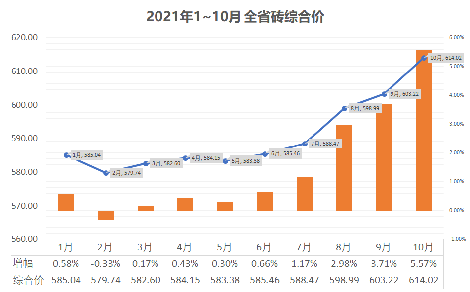 砖在今年7月前,价格都较为平稳,8月开始价格开始逐步上涨,至10月,已比20年12月综合价格上涨5.57%。