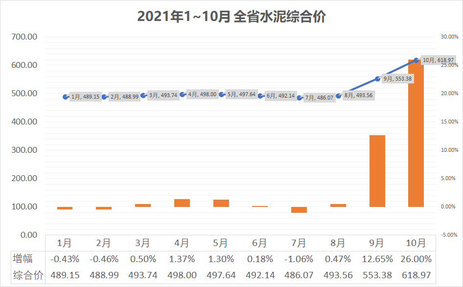 水泥价格在今年9月前,价格几乎未变,8月中旬由于厂商集体涨价,导致9月综合价出现较大幅度的上涨,至10月对比20年12月价格涨幅已达26%。