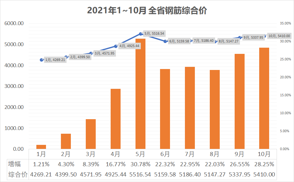 分析报告选取的材料为建筑用砂、建筑用石、砖、水泥、钢筋、商品砼六类材料综合计算,并以2020年12月同类材料价格对比,形成今年1~10月的价格分析报告。其中水泥、钢筋波动幅度最大,水泥自9月起价格呈现大幅上涨,钢筋自4月起呈现大幅上涨,至10月为止,对比20年12月综合价格上涨1/4。详细分析报告如下: