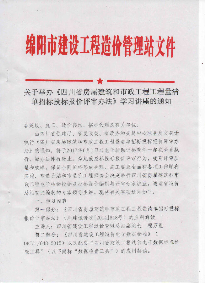 由四川省住建厅、省发改委、省政务和交易中心联合发文关于执行《四川省房屋建筑和市政工程工程量清单招标投标报价评审办法》的通知,将于2017年6月1日与电子辅助评标软件一起在全省执行,原办法即行废止。为规范招标投标报价评审行为,提高评审质量和效率,保证合同价格形成合理、施工要求全面和各项工作顺利实施,市造价站和市造价工程师协会决定举行四川省房屋建筑和市政工程电子招标投标及投标报价编制与评审培训,邀请省造价总站有关编制的专家领导主讲。现将有关事项通知如下: