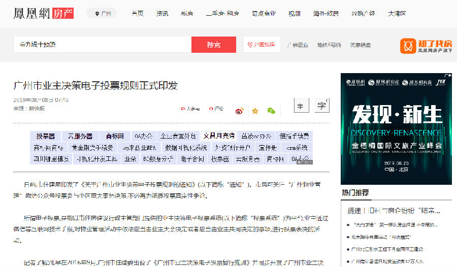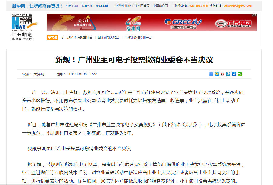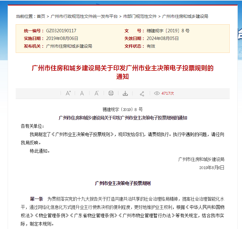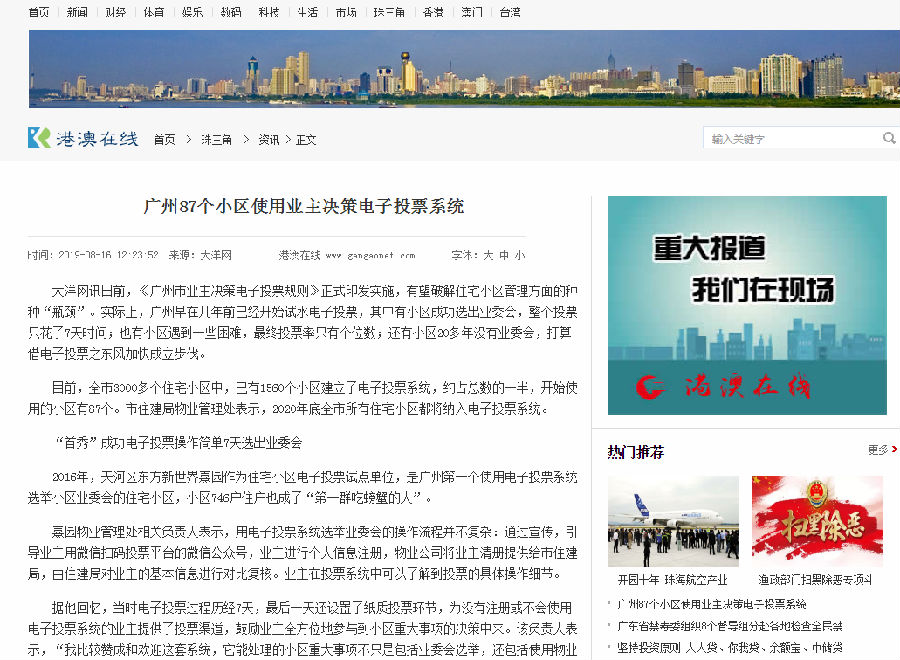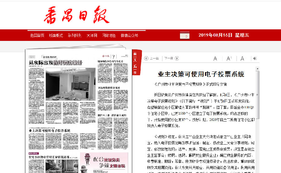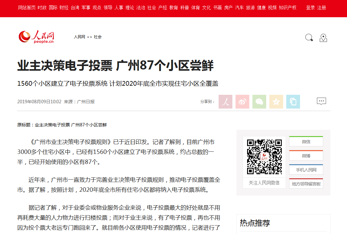 《广州市业主决策电子投票规则》已于近日印发。目前广州市3000多个住宅小区中,已经有1560个小区建立了电子投票系统,约占总数的一半,已经开始使用的小区有87个。市住建局物业管理处表示,2020年底全市所有住宅小区都将纳入电子投票系统。