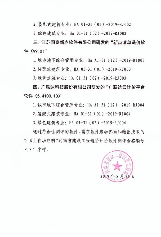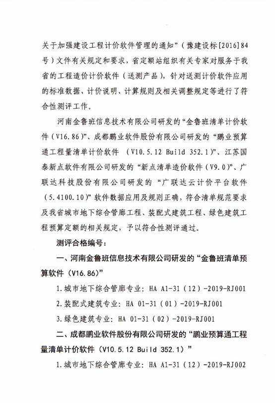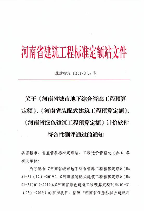 关于《河南省城市地下综合管廊工程预算定额》、《河南省装配式建筑工程预算定额》、《河南省绿色建筑工程预算定额》计价软件符合性测评通过的通知
