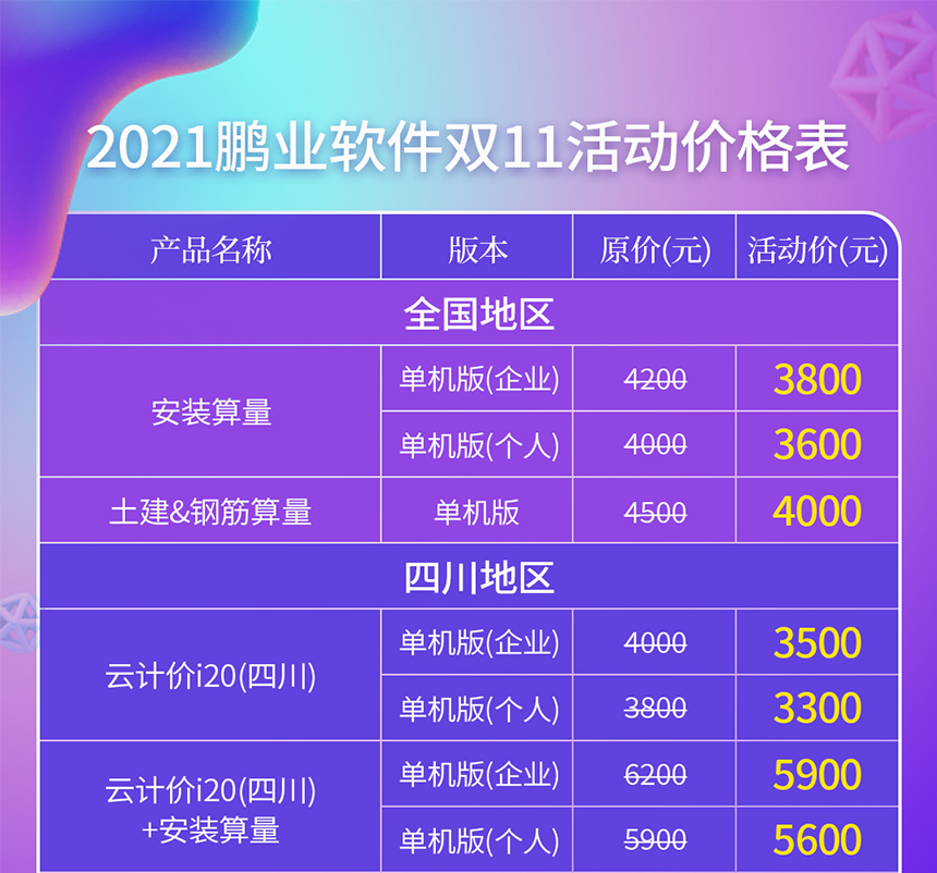 双11活动期间,鹏业软件正版用户,转发10.31日微信文章“鹏业双十一来了!惠购软件抽大奖,直播好礼送不停!”至朋友圈,并截图+软件加密锁锁号发送至鹏业软件公众号后台,即可获得一次抽奖机会。