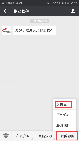 2. 进入鹏业公众号后,选择 "我的服务"→"造价云"即可查看云端数据