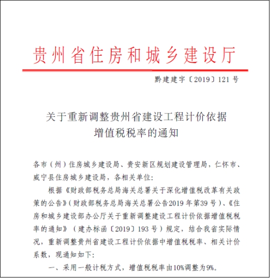 四、黔建建字【2019】121号 关于重新调整贵州省建设工程计价依据增值税税率的通知