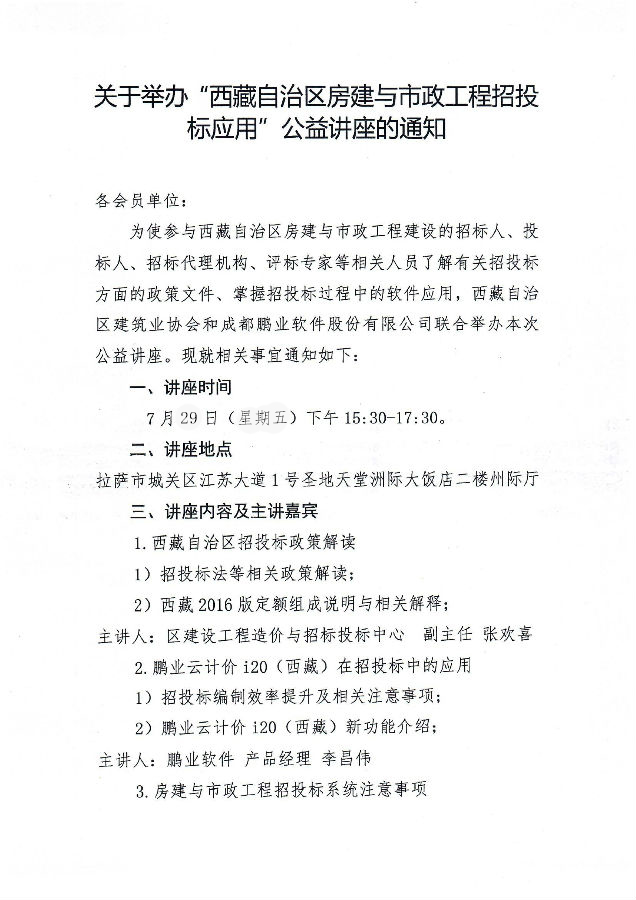 关于举办“西藏自治区房建与市政工程招投标应用”公益讲座的通知