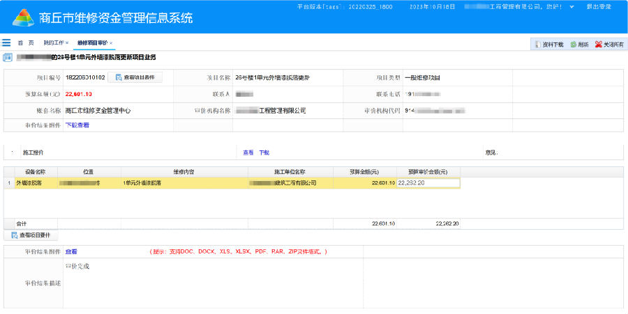 第三方审价单位可通过资金管理平台对维修项目的施工报价进行线上查看,维修项目使用预算金额超过规定阈值时,可对使用项目预算进行在线审价,并可根据现场勘查、沟通结果,实时在管理平台上反馈更新预算审计金额、项目审价资料及项目状态(流程跟踪)等。审价完成后支持审价单位在线上传审价结果附件,主管部门可对审价全流程进行线上监督,确保维修资金的使用能够用得合理、有效、精确,确保物业企业维修合规,施工方案预算合理,工程质量合格,以优质、精细的服务帮助百姓安居。