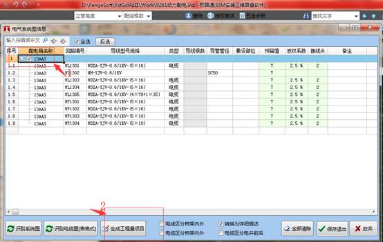 4. 进入电气系统图信息界面,勾选相应的配电箱1,单击生成工程量2.如下图。