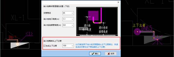 该功能适用于消火栓支管直接从主干管接出,快速生成该支管与主干管链接的上下立管,上下立管的高度根据楼层高度及管道敷设高度自动计算