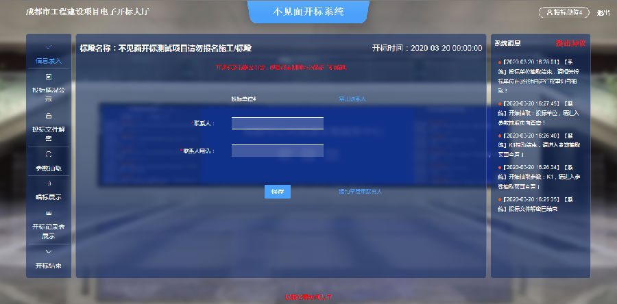 开始开标前,投标人可以手动录入联系人、或者从常用联系人中选择联系人快速录入信息,点击【保存】。