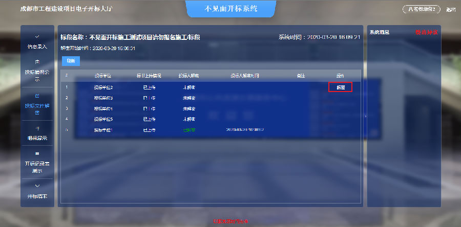 (4)点击【刷新】按钮,刷新当前解密状态,投标单位对应投标人解密栏显示“已解密”,则解密成功。
