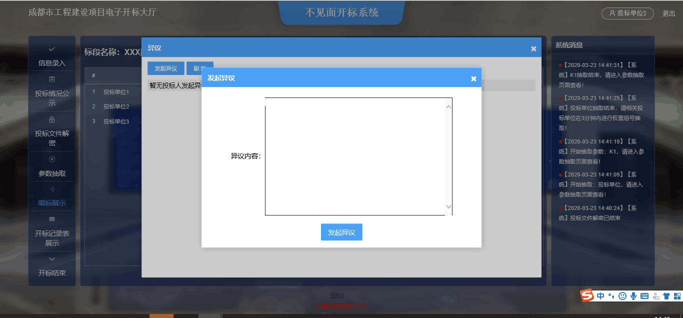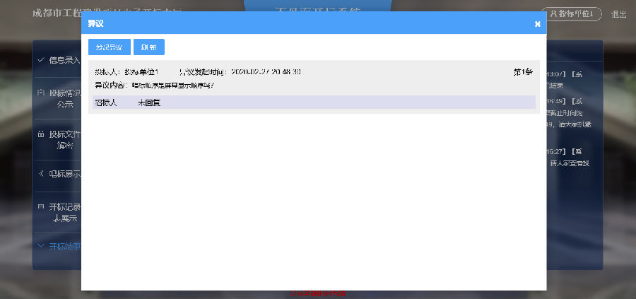 (1)开始开标后,投标人点击【提出异议】,再点击【发起异议】。