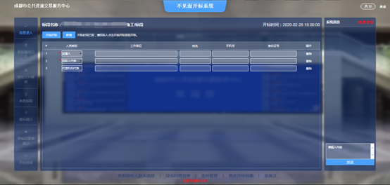 开标前,【开始开标】按钮和左侧“信息录入”模块下方的节点都不可操作。开标人员可以录入到会人员信息: