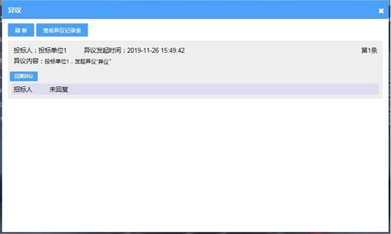 开标人点击【回复异议】按钮,展示所有已发起的异议信息。