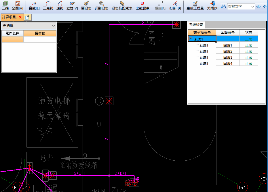 根据当前已有计算项目的图形建立火灾报警模型,在模型中设置设备信息和配管配线,软件智能设置管线的配管配线信息