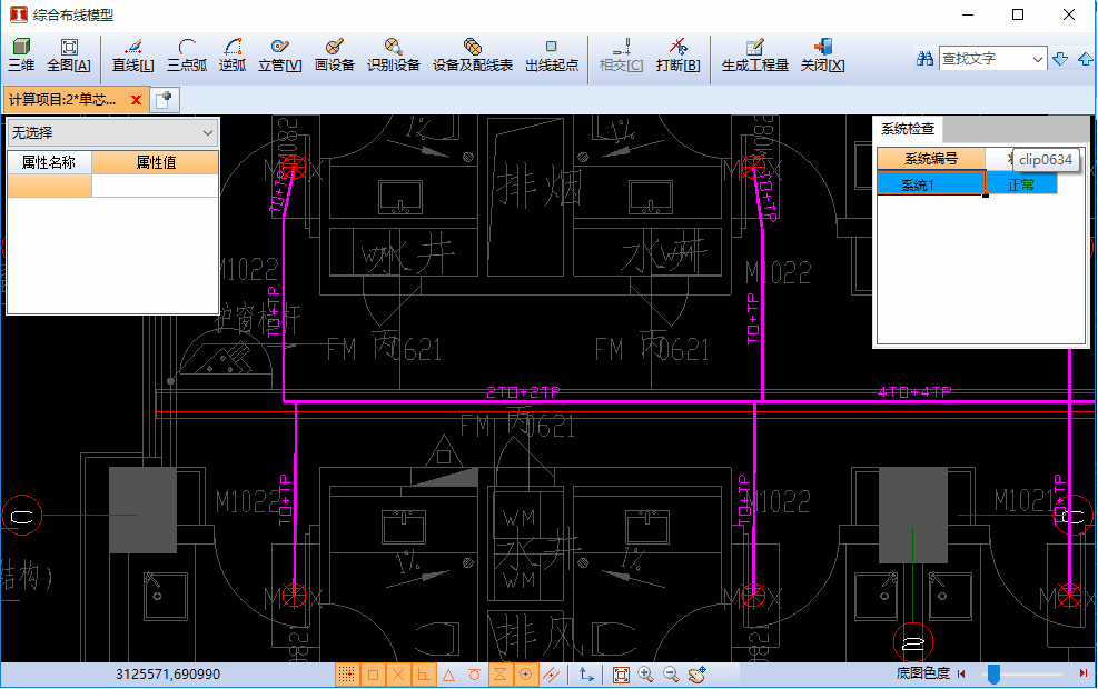 根据当前已有计算项目的图形建立综合布线模型,在模型中设置设备信息和配管配线,软件智能设置管线的配管配线信息