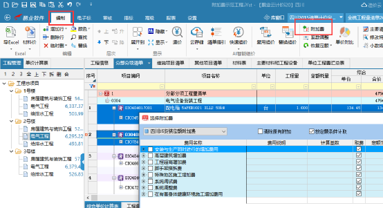 “附加费”功能以定额说明为依据,可根据工程实际需求,灵活选择计取方式、位置。实现快速、批量的计取费用,提高编制人员工作效率。