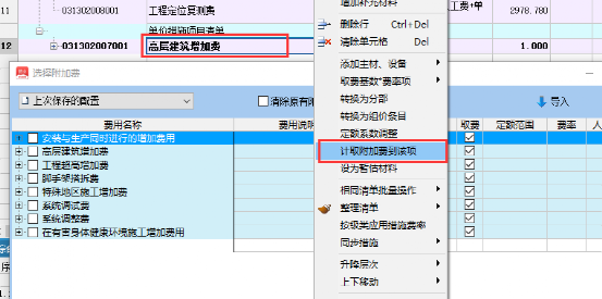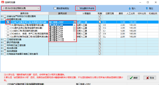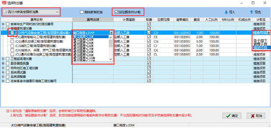 ⒉、若勾选“按定额条件计取”选项,则自动按定额号条件智能判断并计取附加费;不勾选则强制对当前项及子项按选择附加费内容计取。