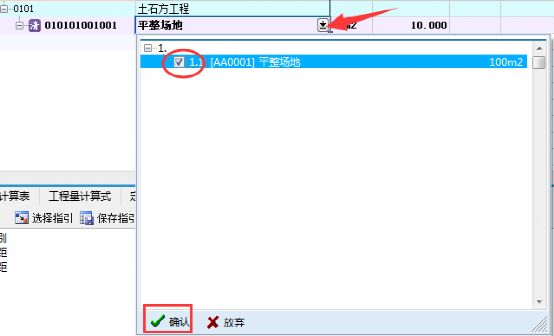 方式4:清单指引:鼠标点到清单项目名称处向下箭头--勾选相应定额--确定,进行定额录入。