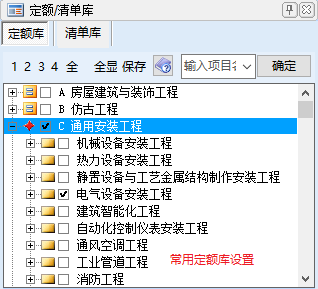 “设置”功能用于设置常用定额库,点击按钮后名称变为“保存”,勾选需设置为常用的定额库,点击保存即可,如下图所示: