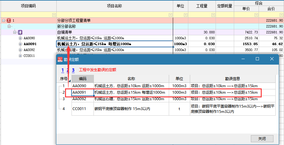 示例:若工程中有以下定额存在勘误,可双击定位到各单位工程进行查看。