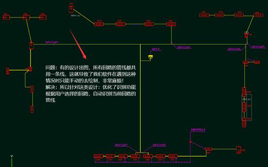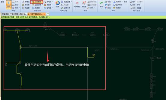 场景:有的设计出图时,所有的回路管线共用一条线(公共线),这就导致软件遇到这种情况时,只能手动绘制,效率低下;现在优化回路识别功能,设置好(配电箱)起点后,识别时自动区分回路,大大提升了工作效率。
