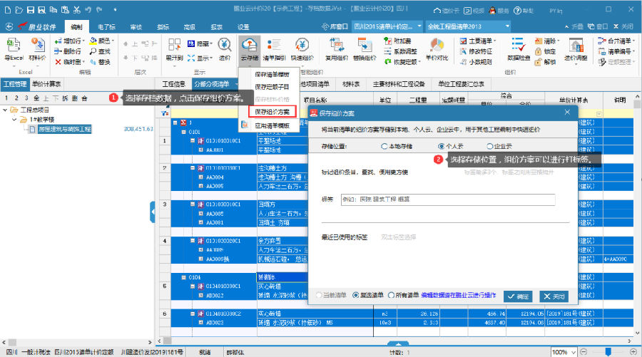 存档数据:打开工程选中需要存档的数据进行保存组价方案。