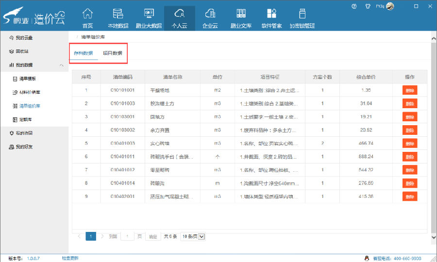 项目数据:上传到云盘进行智能分析。存储相应组价方案。
