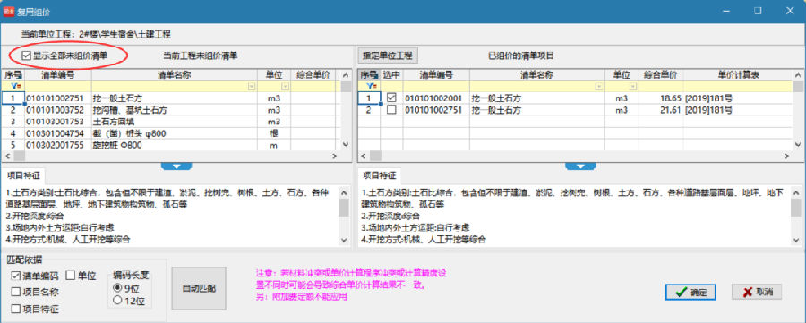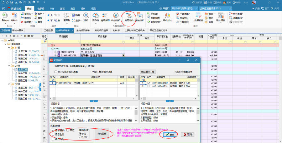 在造价编制过程中,同一工程项目,单体很多,每个单位工程清单子目类似,当组价完一个单位工程的清单子目,剩下的清单想借用其组价内容,就可以通过灵活运用“复用组价、替换组价”功能快速完成组价。