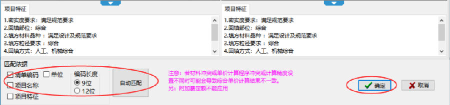 2、选择“匹配依据”条件,然后选择“自动匹配”按钮,按“确定”即可完成组价。