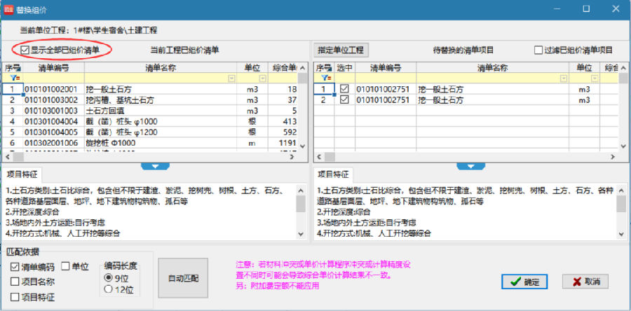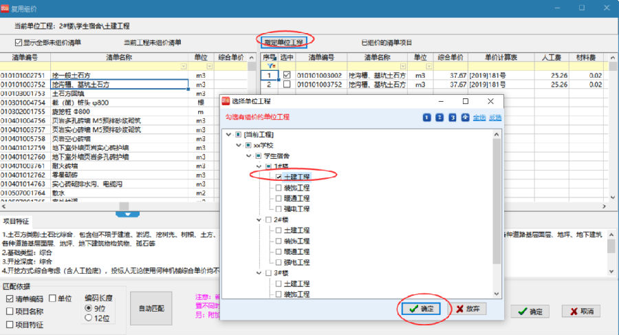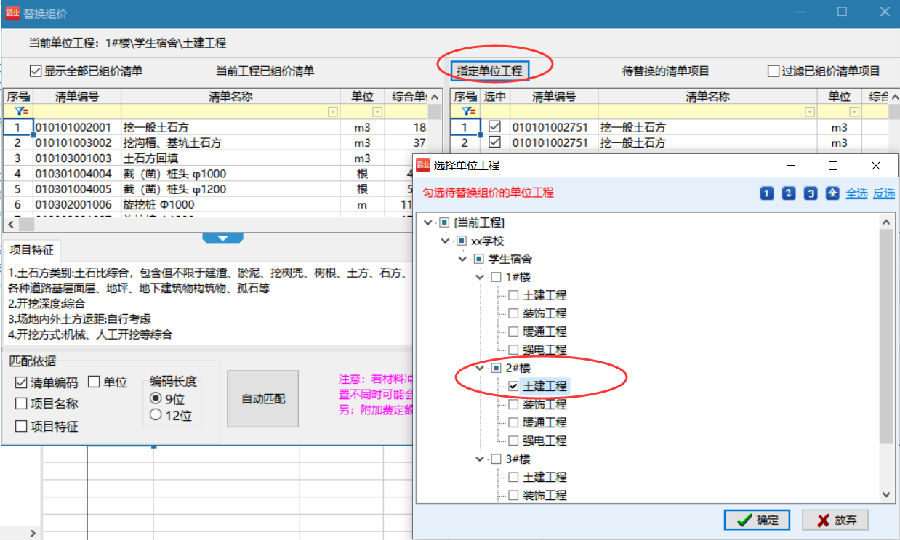 2.如在众多单位工程中,勾选指定的待替换组价的单位工程,可以通过设置“指定单位工程”来实现;