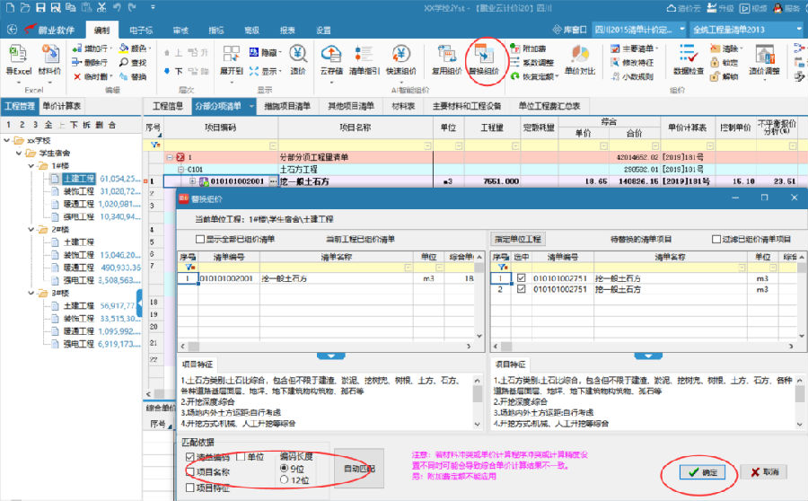 1、选择已组价的单位工程——分部分项清单里,选择“替换组价”按钮。