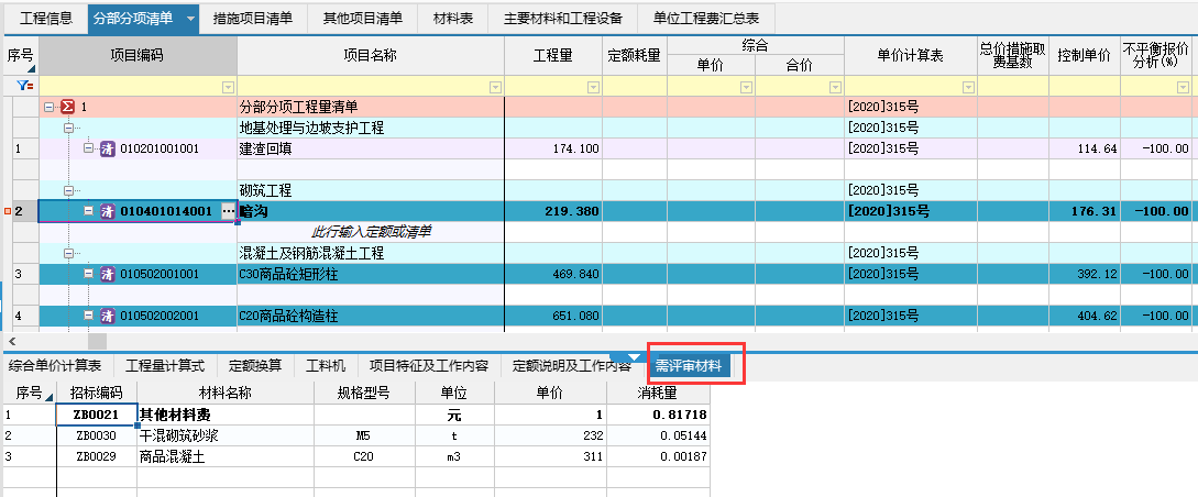 6.在分部分项界面能实时显示控制单价和组价后的不平衡报价,方便调整。