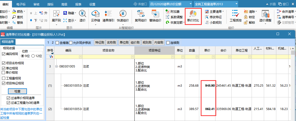 工程编制完成后,通过单价对比功能对相同的清单有不同的单价进行筛选,方便快速调整。