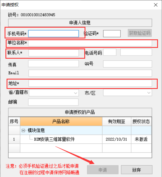 2.进入软件管理界面,点击“申请授权”,输入手机收到的验证码,并准确填写您的个人信息,点“申请”即可。