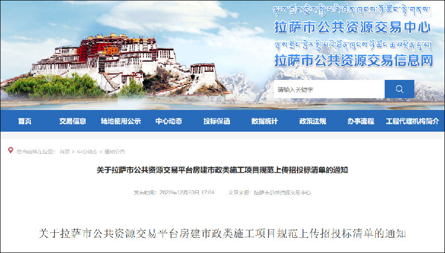2022年12月30日拉萨市公共资源交易中心发布了《关于拉萨市公共资源交易平台房建市政类施工项目规范上传招投标清单的通知》,从2023年1月3日起,各招投标代理机构通过平台发布房建市政类施工项目招标文件时,请上传.xml、.XZZB格式的招标清单文件;投标人在上传房建市政类施工项目投标文件时,请上传*.xml、*.XZTB、*.ZJQ格式的投标清单文件。