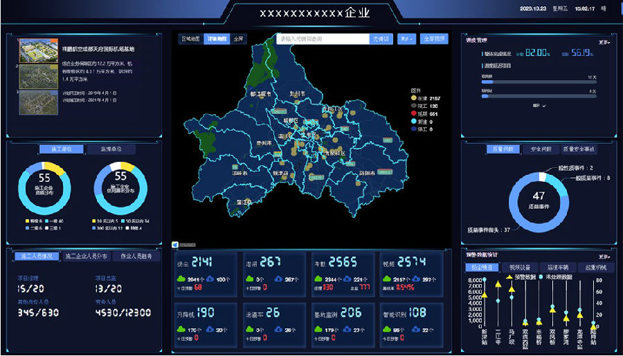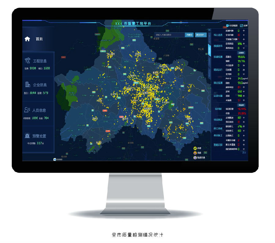 数据管理分析是一个顶层平台,以企业、人员、项目为基础,通过建立数据标准和协议,对智慧工地相关各子系统数据进行全方位采集,形成工地大数据中心,并利用大数据分析技术,对质量、安全、文明施工等多个维度进行统计分析,辅助管理层决策动态掌握建设情况和突出问题,提升科学决策能力。该平台通过GIS地图集中展示全市项目的建设情况,并对全市企业、从业人员以及项目的质量、安全、进度、建筑机械、运输车辆、扬尘、商混(砂浆)、AI识别等多个维度数据的发展态势进行分析,并支持个性化定制和扩展。